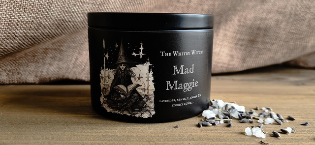 In the shadow of Whitby's 199 steps, where the sea whispers secrets and ancient legends linger, there lived a witch named Mad Maggie. Her presence was both feared and revered, a mysterious figure who danced between darkness and light. This candle captures the essence of her mystical aura, blending fragrances that echo her enigmatic past.